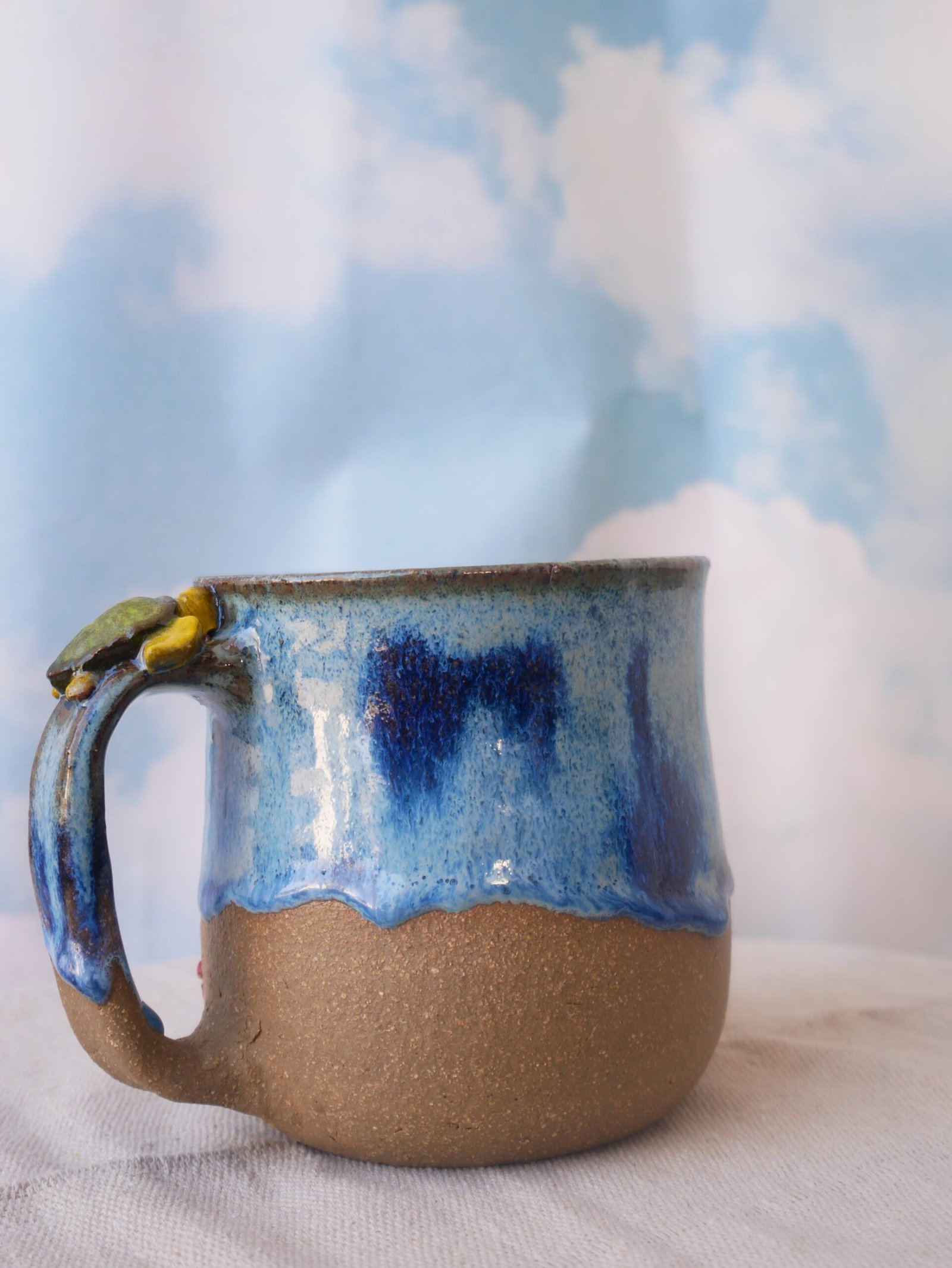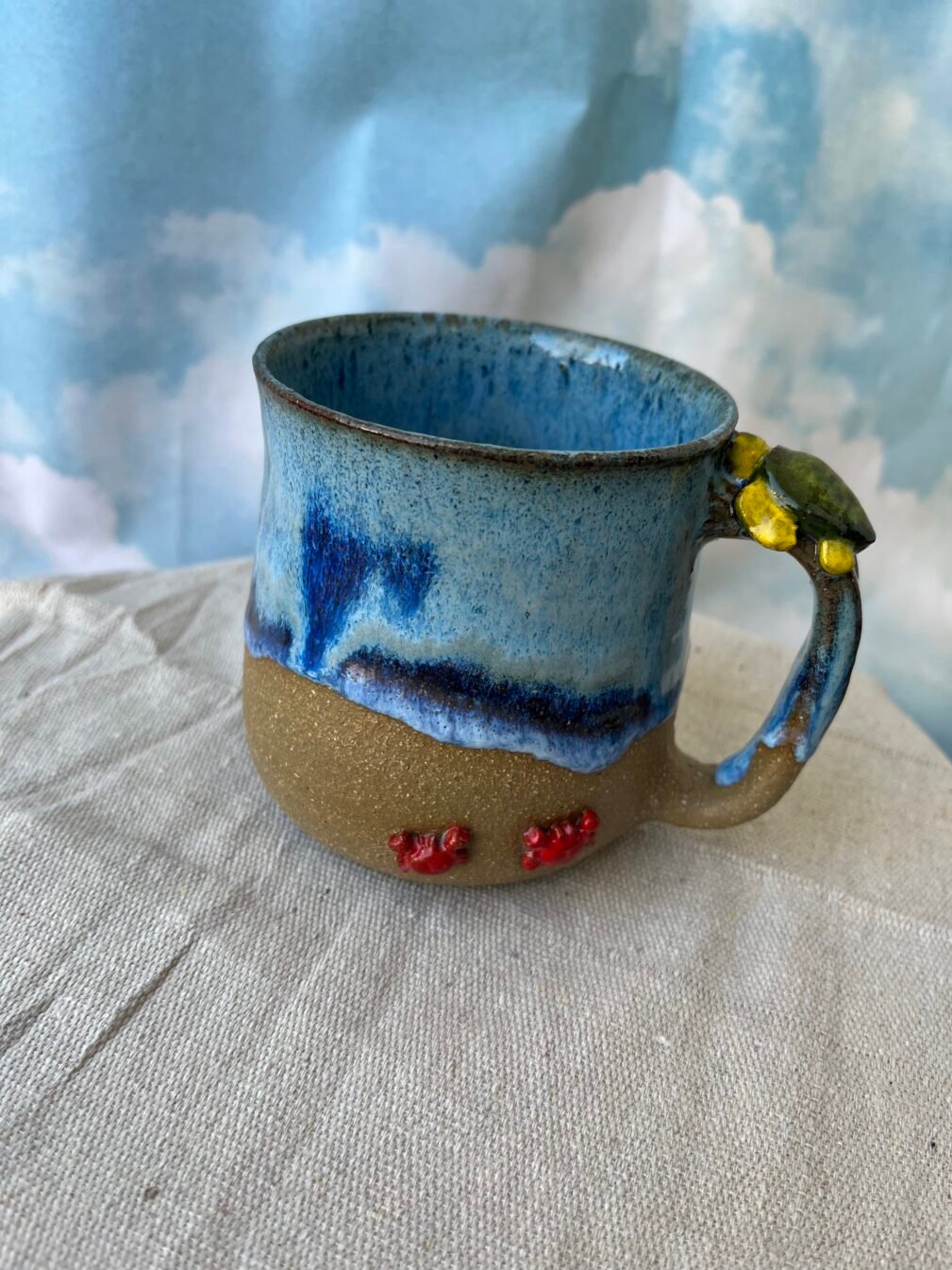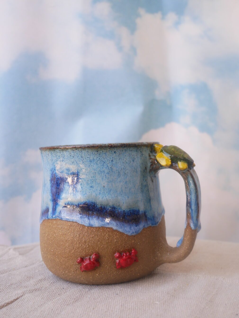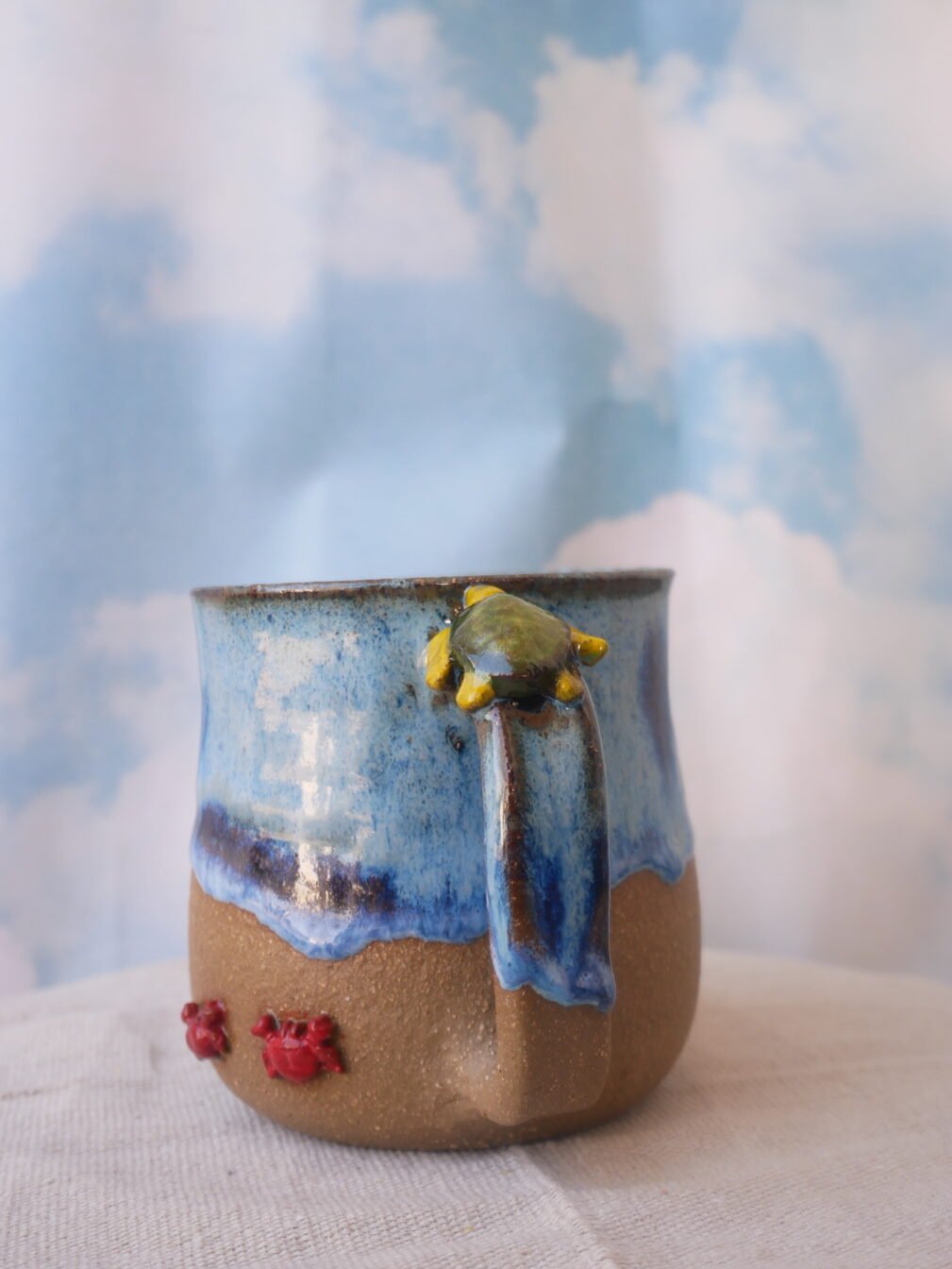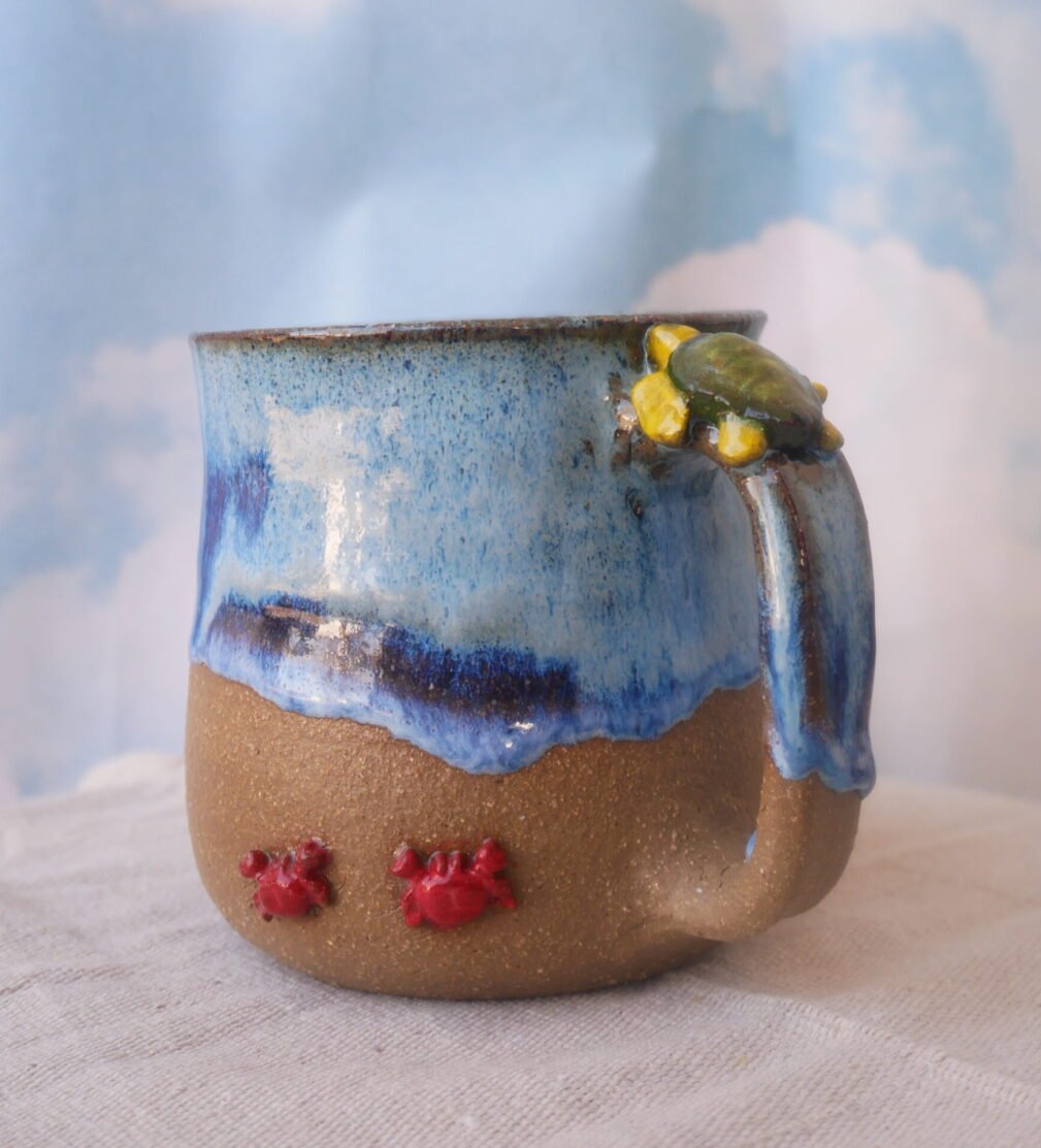 Bring the beach to your coffee break with the **Seaside Escape Mug**! This handmade ceramic piece captures the essence of the shore, with a sandy-textured base, deep ocean blue glaze, and charming little red crabs scuttling along the beach. A tiny sculpted sea turtle perches on the handle, making every sip a seaside adventure. Perfect for ocean lovers and dreamers who long for a taste of the coast with their morning brew!